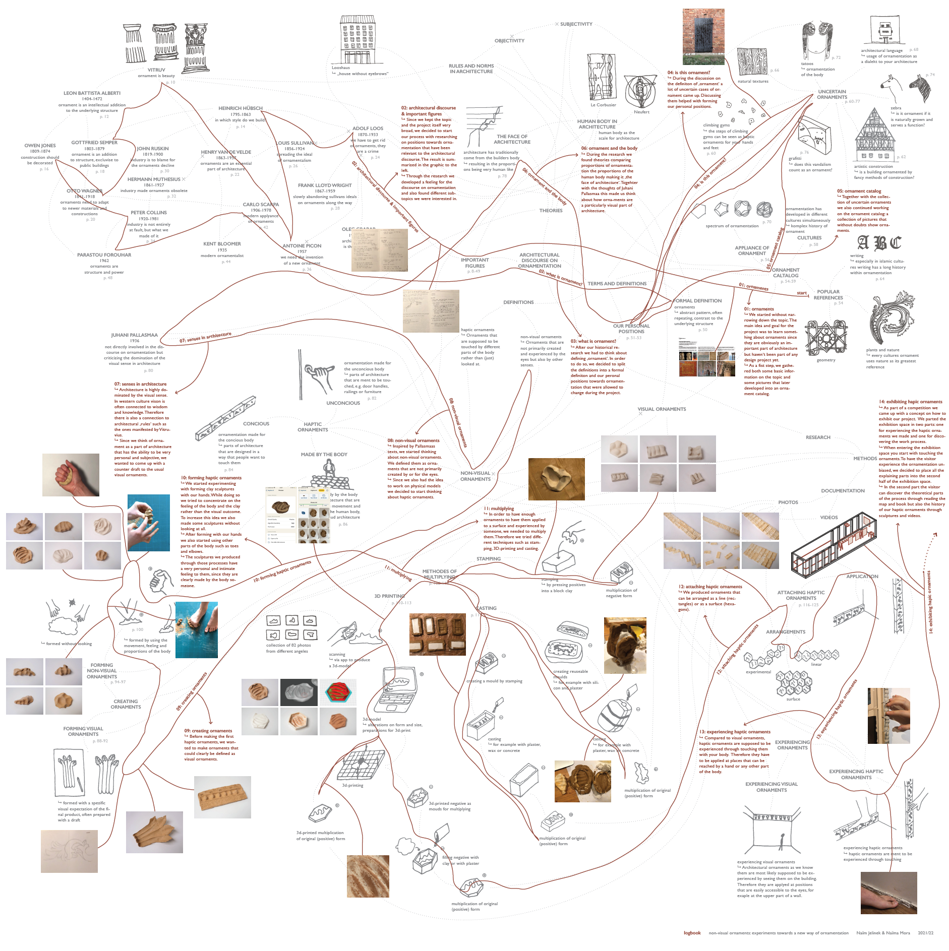 "Ornamente" war das Thema meines zweiten Open Studios. Glücklicherweise schloss sich nach zwei Wochen Naima dem Projekt an, wodurch wir tiefer in das Thema eintauchen und mehr experimentieren konnten. Das Projekt begann sehr architekturtheorie-lastig; in den ersten Wochen arbeiteten wir uns durch alle Fachlektüren, die Ornamente auch nur erwähnten.